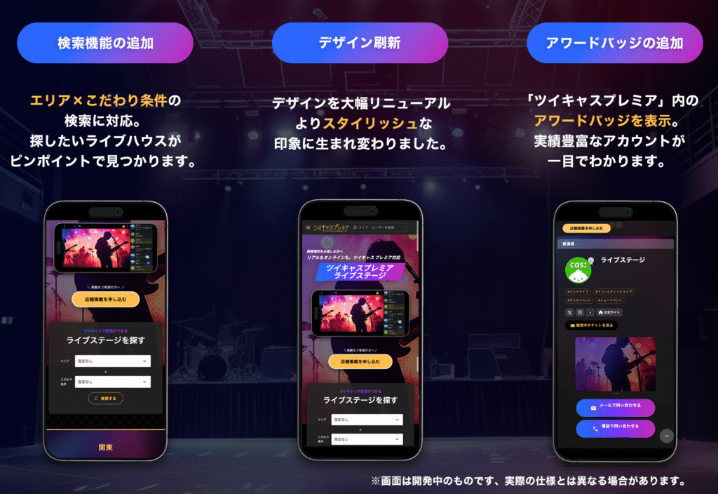 2025年7月に導入した『ツイキャスプレミア』内の配信実績に基づく「アワードバッジ」を獲得したライブハウスには、バッジが表示されるようになりました。配信者が会場を選ぶ際の参考として、よりわかりやすく・使いやすい設計となっています。